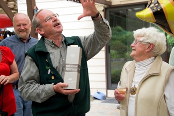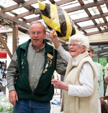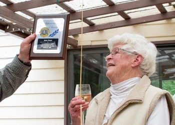 The Gabriola Lions held their annual end-of-the-year BBQ June 25, 2012. It was an occasion to honour our very special Lion, Joan Ensor. We all sang "happy birthday" as she is nearly 90 years old, and as active as anyone in the club. Lion President Mike Phillips presented her with her secret of longevity, a bottle of a good single malt, a stone rake (her favourite garden tool), an appropriate apron, a floating "lion", and a plaque of appreciation for her enthusiastic inspiration for us all.