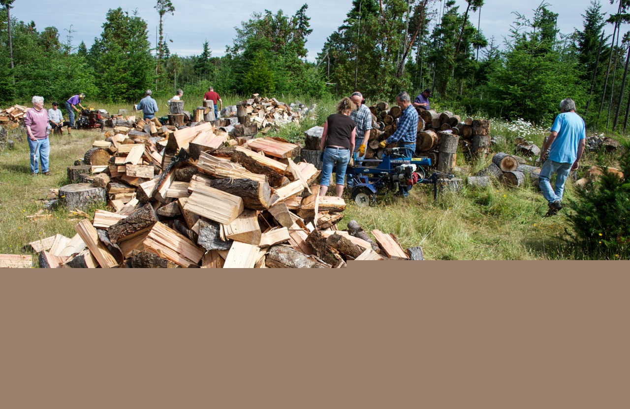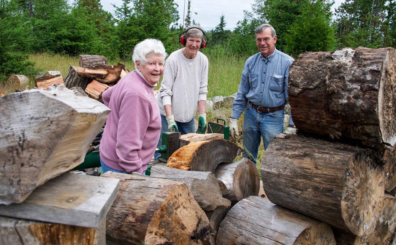 Lions Joan Ensor and Mike Hoeinghaus work the log splitter with Gisela Cavill