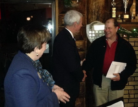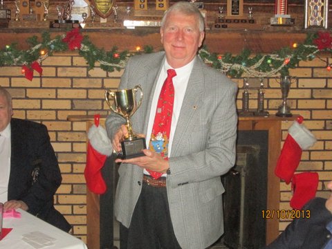 Lion Bill Kalbfleisch shows the trophy he was awarded as Lion of the Year at the Christmas / Holiday Dinner on Dec 9. (Photo: Burney Smith)