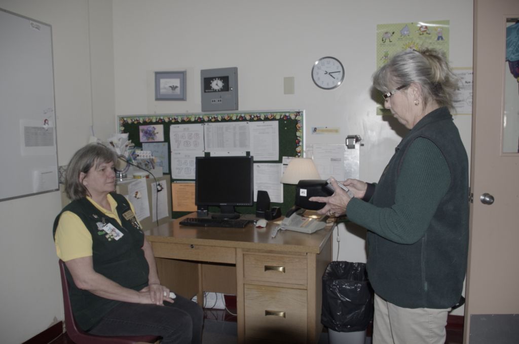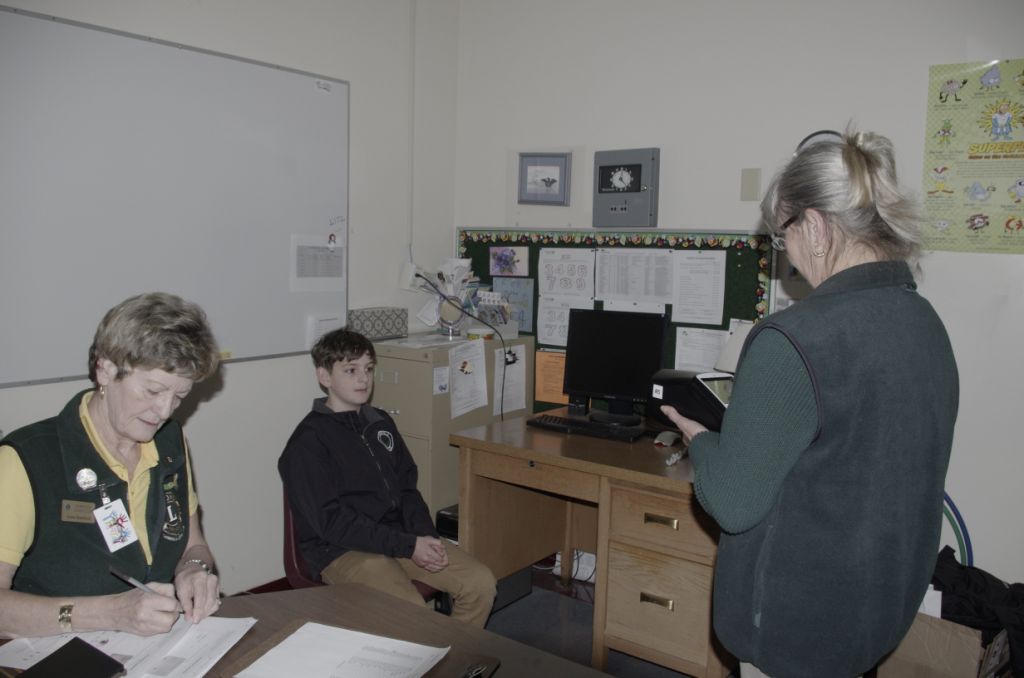 Gabriola Elementary School student Caleb Nittel simply has to look at the SPOT Screener held by Lion Merrilee Wur to have his eyes checked. Caleb's grandmother, Lion Anne Banford, completes the log.
